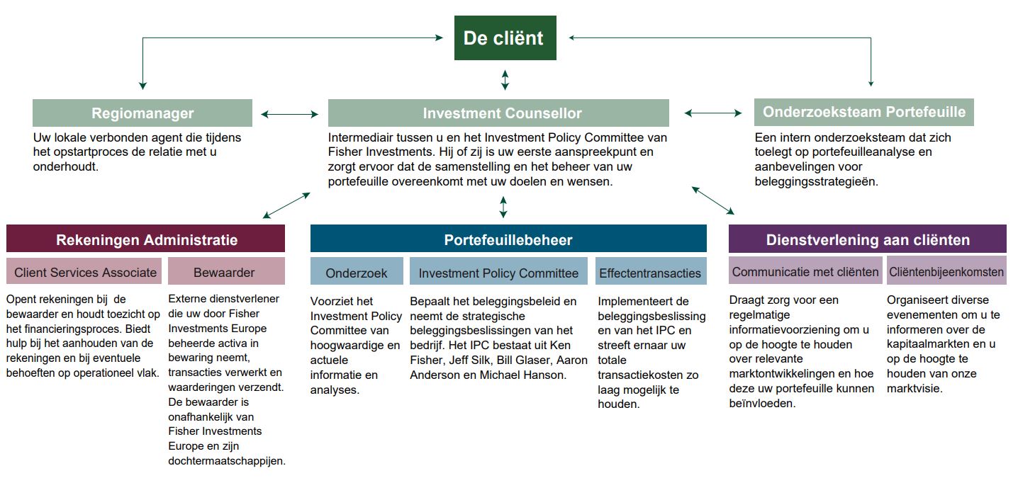 Wanneer u eenmaal cliënt wordt, zal Fisher Investments BelgiĆ« optreden als uw vermogensbeheerder. De aspecten van het dagelijkse beleggingsadvies, portefeuillebeheer en portefeuillehandelingen worden gedeeltelijk uitbesteed aan gelieerde ondernemingen. De besluitvorming over de portefeuillestrategie wordt in het bijzonder uitgevoerd door Fisher Investments, ons moederbedrijf in de VS en is gereguleerd door de Amerikaanse Securities and Exchange Commission (SEC). Voor verdere informatie verwijzen we u naar de pagina 'Informatie over regelgeving.'